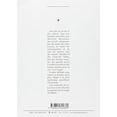 Lieu des au revoir et des adieux, lieu aux histoires meurtries, aux décisions décousues, aux envols vainqueurs, lieu de toutes les souffrances, de toutes les interrogations et de tous les espoirs, lieu des larmes chaudes et des serments hâtifs, lieu des derniers sourires, des paroles qu'on n'oubliera jamais et des baisers donnés pour la vie, voici la gare. La gare déclinée sous toutes ses formes, de la plus banale à la plus inattendue, grouillante d'humanité. Une multitude de trajectoires individuelles juxtaposées par la magie du théâtre.
